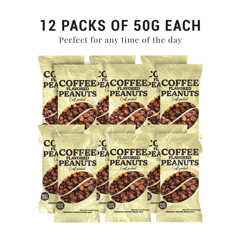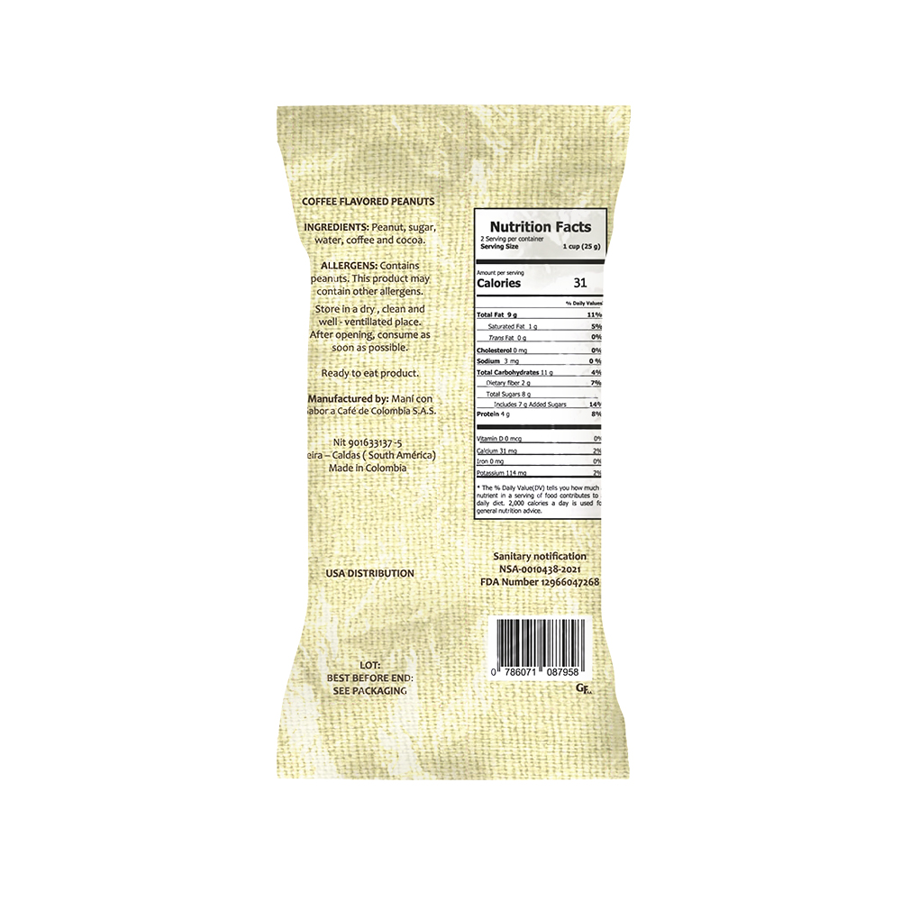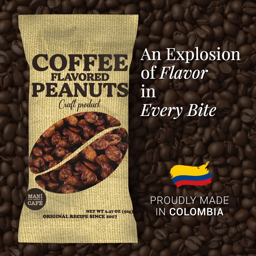 Discover a unique snacking experience with our coffee-flavored peanuts, a delicious artisanal blend that will surprise you from the first bite. Crafted with an original recipe that has delighted our customers since 2017, this product is perfect for those seeking a different and tasty snack. Each package contains 12 units of 1.76 oz, ideal for taking anywhere and enjoying at any time of the day. Our high-quality ingredients include peanuts, sugar, water, coffee, and cocoa, all carefully selected to offer you a burst of flavor in every bite. Proudly made in Colombia, these coffee-flavored peanuts are not only delicious but also safe, with a sanitary registration. Perfect for sharing with friends, enjoying at the office, or simply as a personal treat. Dare to try this Colombian delight!